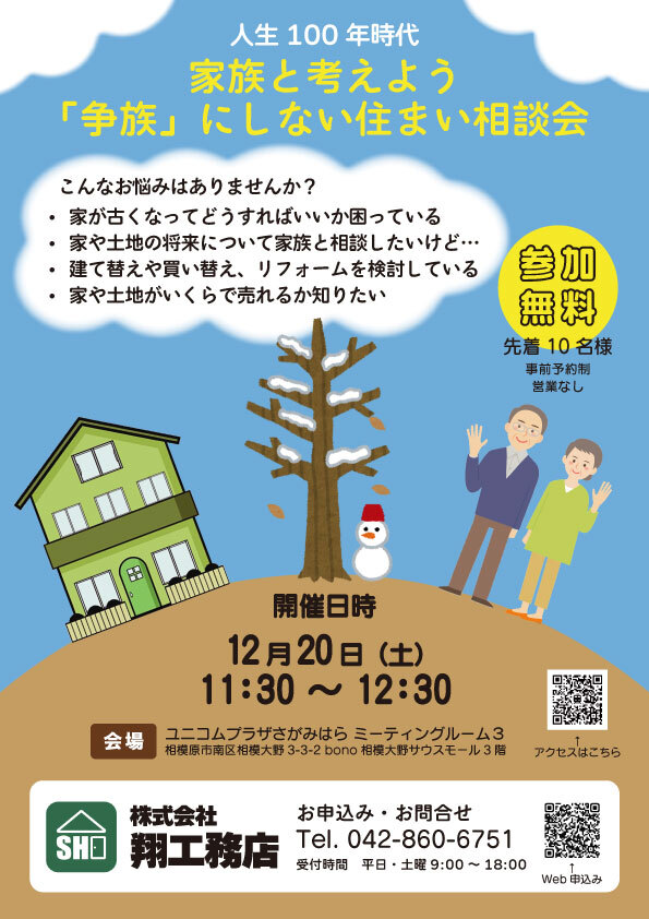 人生100年時代、100歳まで生きるとは言いませんが、かなりの高齢まで生きられる可能性が高くなっているのは事実です。近い将来、70歳定年制になるのは必至です。これからは働き方も、生きかたも、そして住まい方も変わってきます。それに合わせた、いまの住まいのあり方を、今のうちから真剣に考える必要があると思っています。翔工務店ではリフォームをはじめ、建て替えの検討までを視野に入れたご提案をさせていただいております。リフォームなのか、建て替えなのか、どちらがいいのかの分岐点は状況により異なります。リフォームや建て替えをご検討の方は、是非一度お問い合わせください。